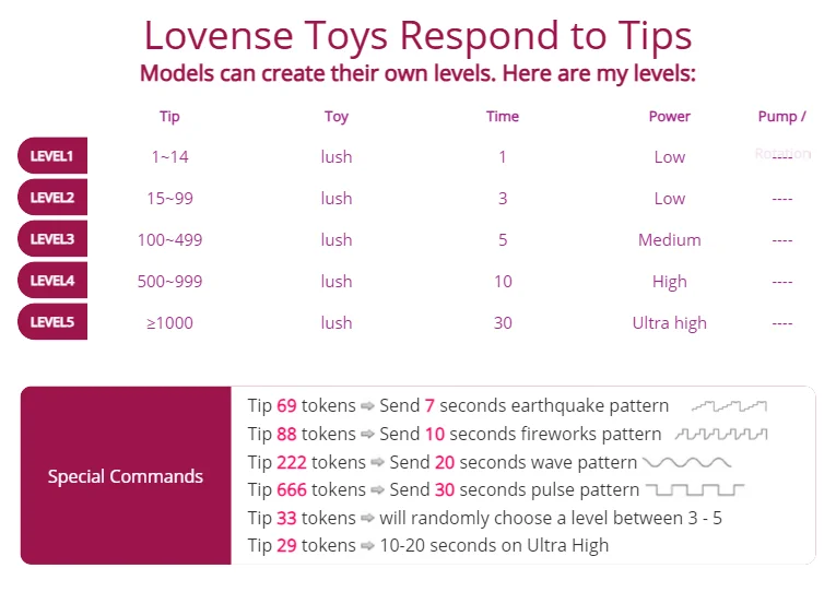 Lovense Toys respond to tips. Here are my levels: