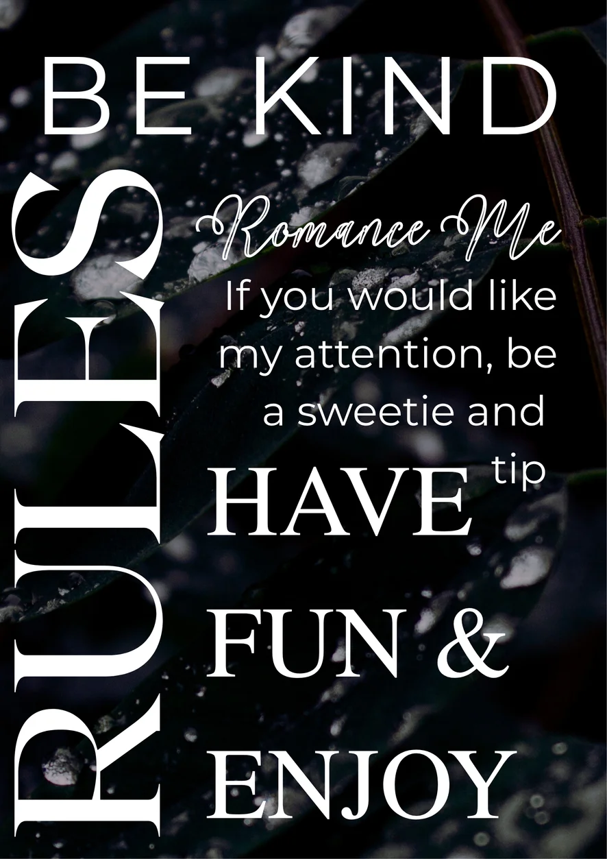 Pompino, Valutazione del cazzo, Linguaggio esplicito, Pecorina, Esibizionismo, Ballo erotico, Ripresa della gonna da sotto, Topless, Spogliarello, Gola profonda, Sega, Ditalino, Facesitting, Spettacolo con olio, Sculacciate, Dildo o Vibratore, Feticismo dei piedi, Umiliazione, Istruzioni per sborrare, Orgasmo, Giocattoli erotici, Giochi di ruolo, Masturbazione