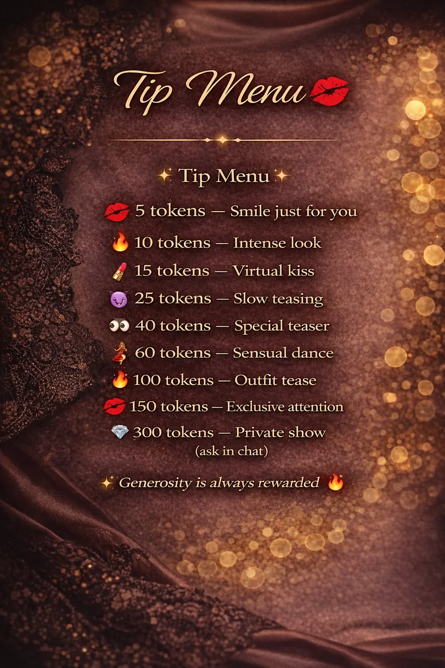 ✨ Tip Menu ✨ 💋 5 tokens – Smile just for you 🔥 10 tokens – Intense look 💄 15 tokens – Virtual kiss 😈 25 tokens – Slow teasing 👀 40 tokens – Special teaser 💃 60 tokens – Sensual dance 🔥🔥 100 tokens – Outfit tease 💋😈 150 tokens – Exclusive attention 💎 300 tokens – Private show (ask in chat) ✨ Generosity is always rewarded 😌