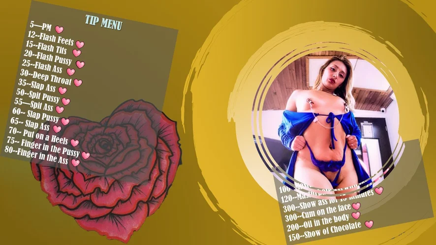 Ahegao, Sculacciate, Ballo erotico, Zoccolo di cammello, Esibizionismo, Topless, Twerk, Tacchi, Pecorina, Ditalino, Dildo o Vibratore, Spogliarello, Gola profonda, Giocattoli erotici, Masturbazione, Sega, Donna sopra, Anale, Da bocca a culo, Linguaggio esplicito, Umiliazione, Istruzioni per sborrare, Giochi di ruolo, Orgasmo, Squirt, Hardcore